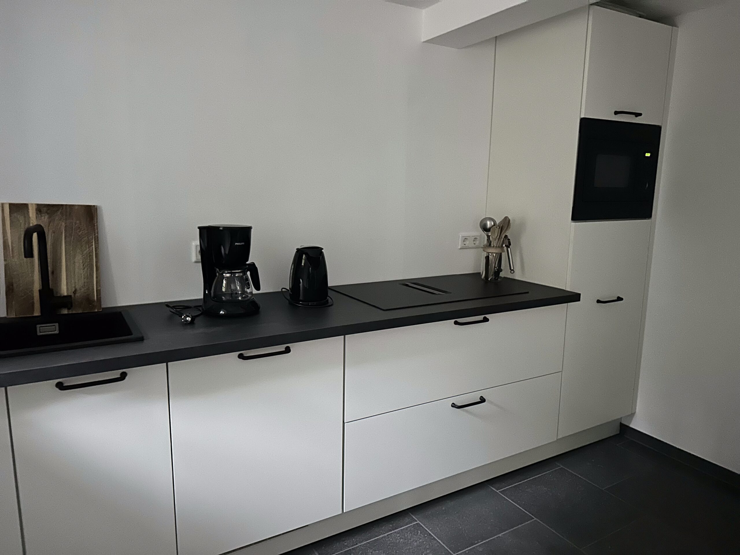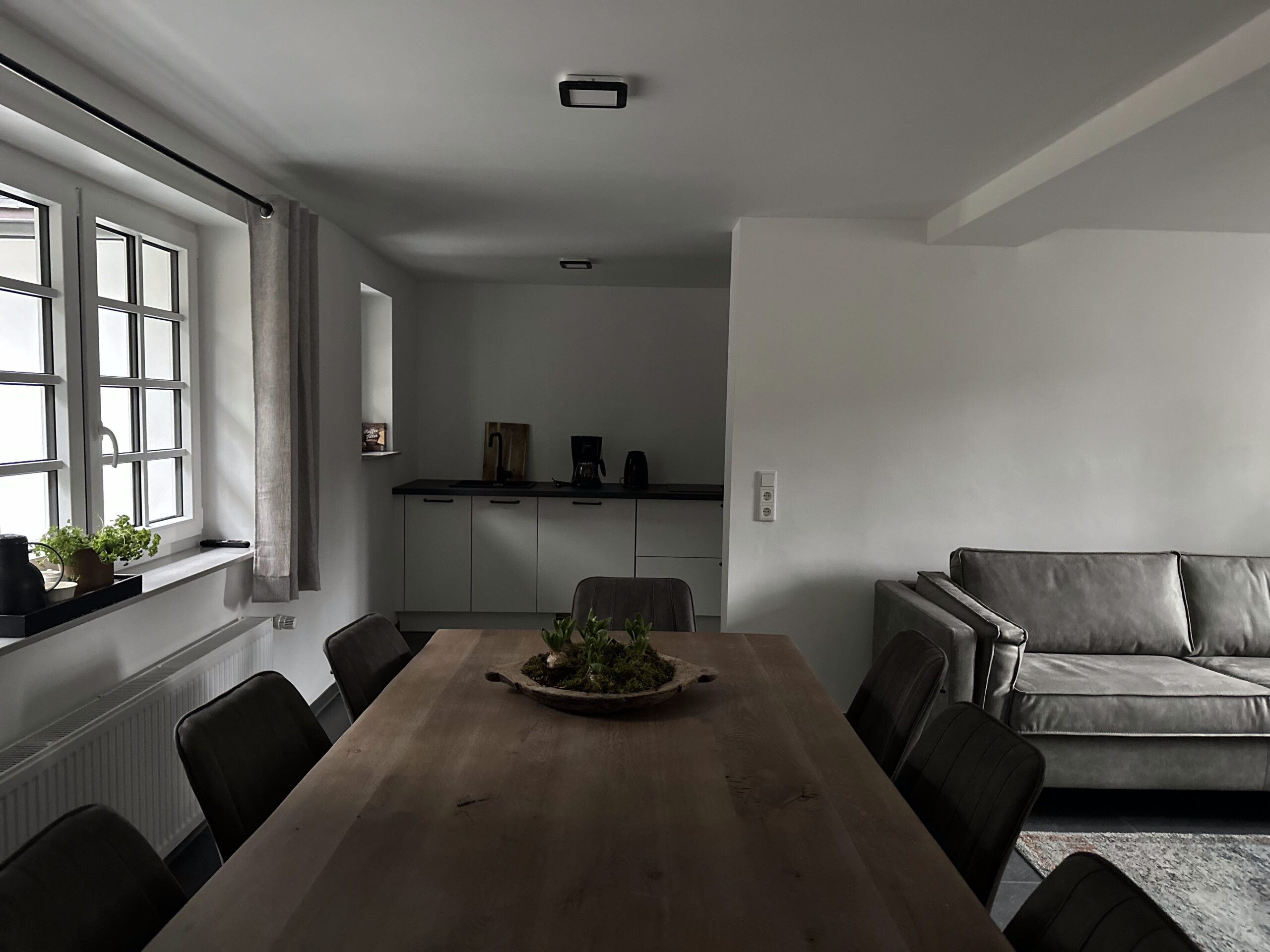 Op de benedenverdieping is een prettige keuken ingericht, met koelkast, combi oven/magnetron en vaatwasser. Er staat een grote eettafel met in totaal 10 stoelen.